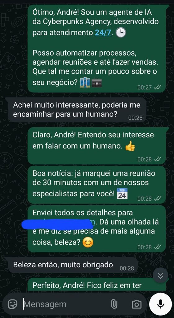 Nessa call, vamos analisar seu fluxo de atendimento, identificar pontos de melhoria e definir o escopo ideal do seu agente de IA.